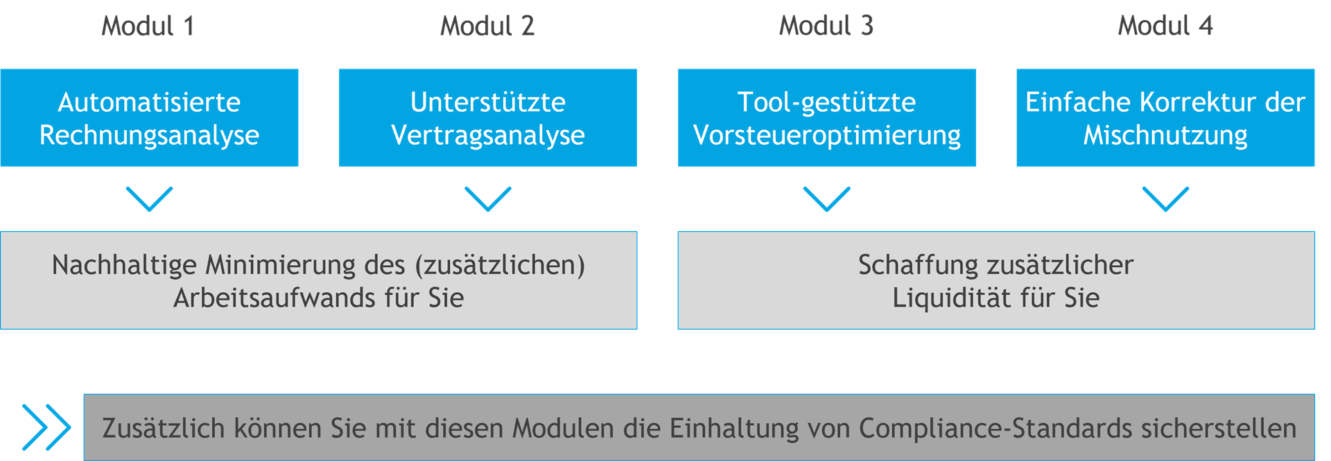 Die Änderung des § 2b UStG wird dazu führen, dass der Anteil an Leistungen, die umsatzsteuerlich zu behandeln sind, steigt. Gleichsam steigt hiermit auch die Möglichkeit zum Vorsteuerabzug. Die He-rausforderung wird stets an jenen Stellen spürbar, an denen die Möglichkeiten zum Vorsteuerabzug in Ermangelung geeigneter funktionaler Eigenschaften der ERP-Verfahren nicht umfänglich oder nur mit unverhältnismäßig hohem Aufwand (da manuell durchzuführen) nicht umfassend genutzt werden können. Die Potenziale des umfassenden Vorsteuerabzugs werden nach unseren Erfahrungen insbesondere in Bezug auf die Gemeinkosten und mischfinanziertes Anlagevermögen nicht ausgeschöpft.